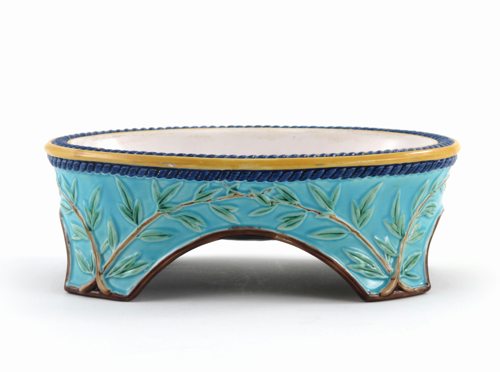 A George Jones Majolica dog bowl c.1870, the sides moulded with crossed leafy stalks supporting the oval bowl, blue pad mark, rim chip, 25cm dia.
