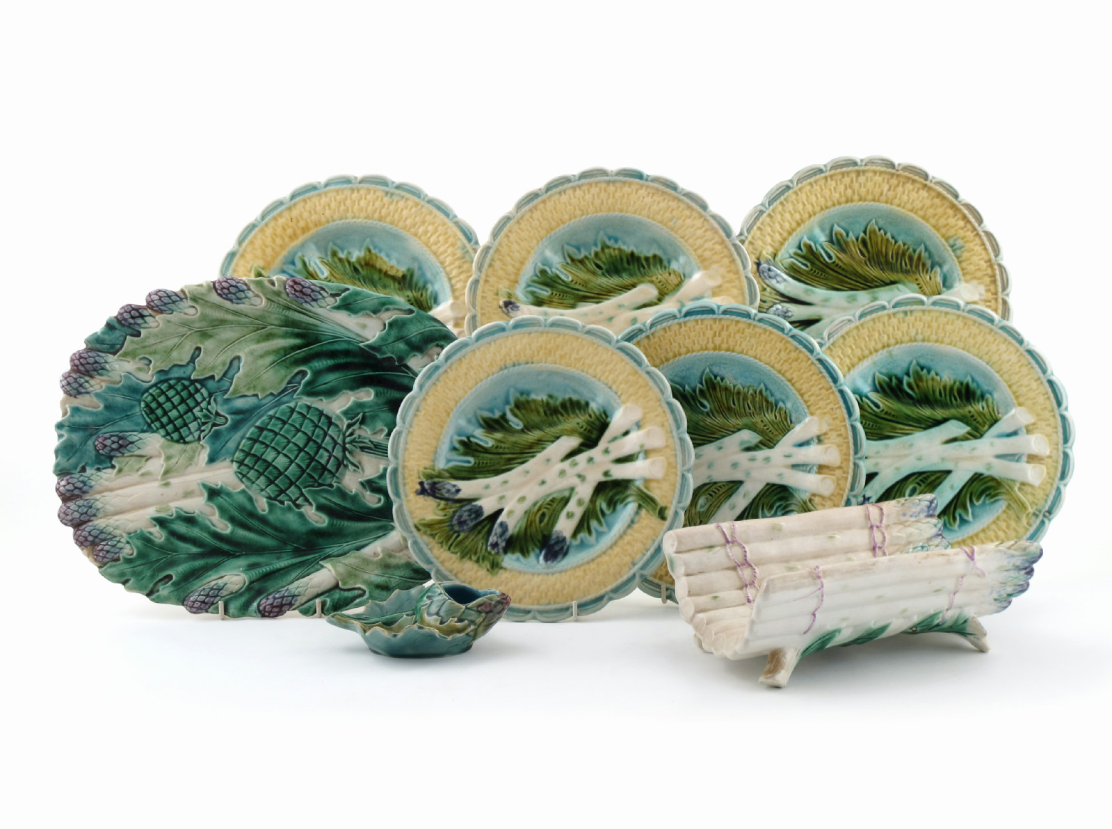 A Majolica asparagus service 19th century, moulded with asparagus spears and leaves within basket borders. Comprising: a large platter, an asparagus server, a small dish and six plates. (9)