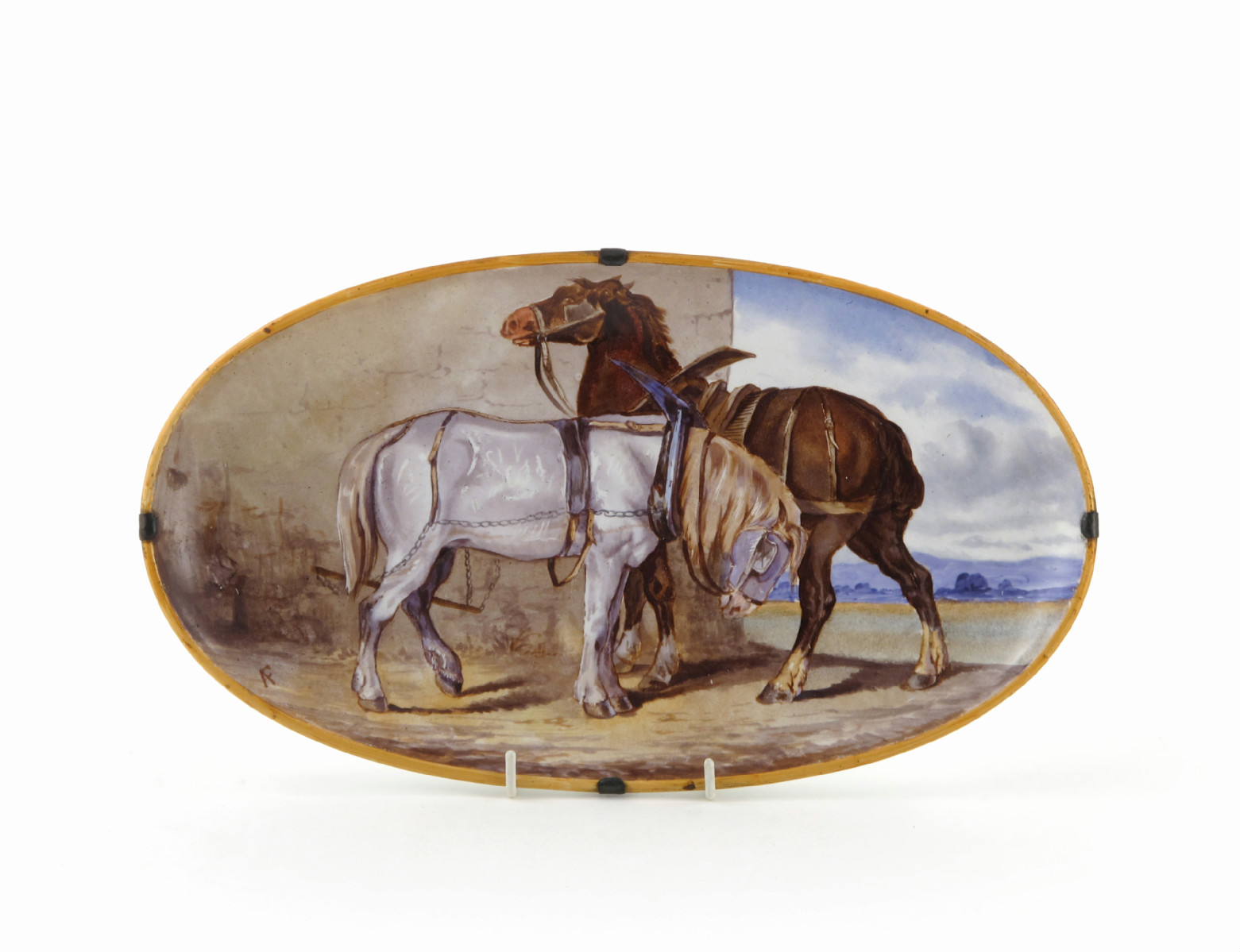 A Choisy Le Roi oval majolica dish early 20th century, painted with cart horses standing before a sea wall, 'AF' monogram, printed mark to the reverse, 34.5cm.