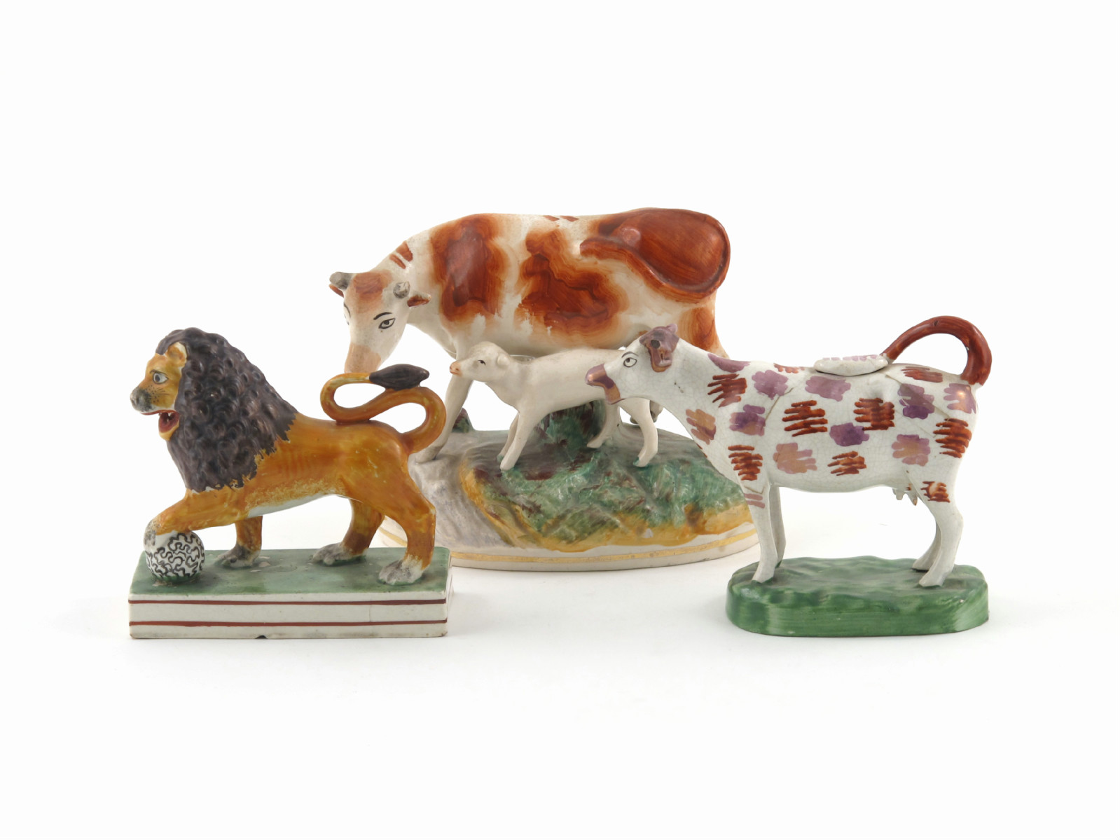 Three Staffordshire animal groups 19th century, one a pearlware lion resting his forepaw on a ball, a lustre decorated cow creamer and cover, and a model of a cow and her calf, some damages, 20.5cm max. (4)