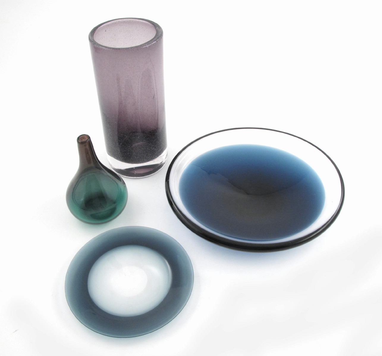A Wedgwood glass bowl, the design attributed to Ronald Stennett-Willson, blue glass well cased in clear, a plate by Timo Sarpaneva, a Hadeland solifleur vase and another vase various marks, Wedgwood bowl 26cm. wide