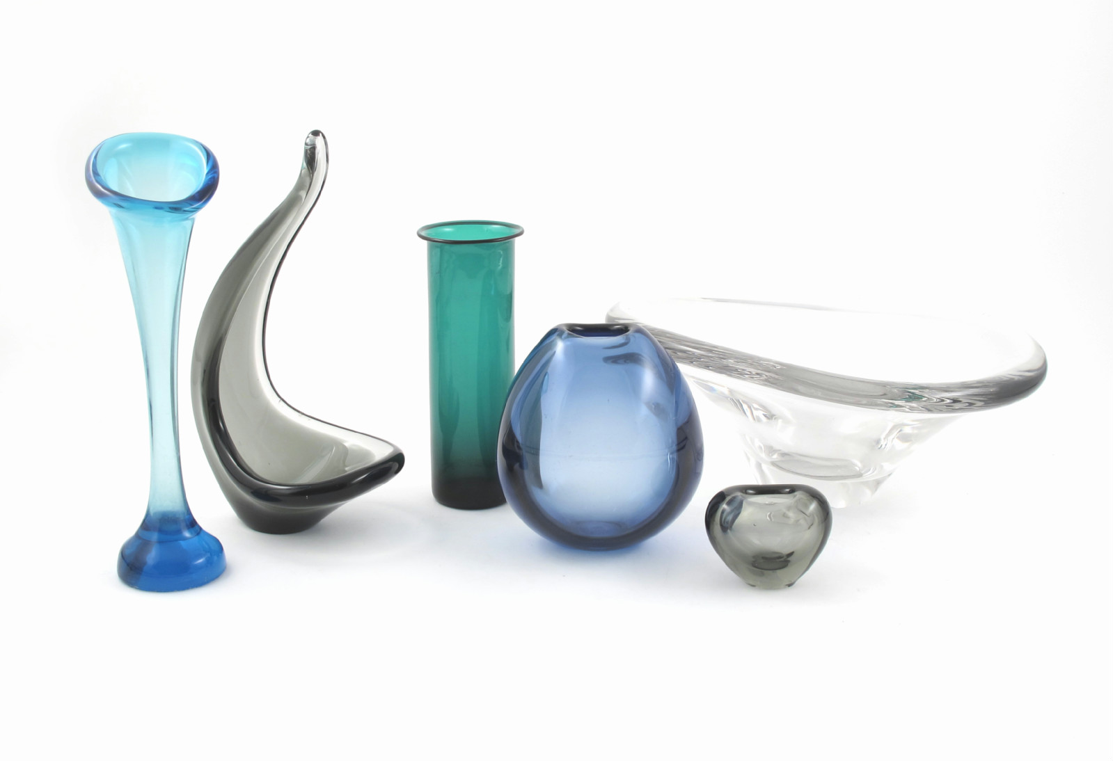 A Holmegaard glass vase, ovoid blue glass with oval aperture, and five other glass items similar etched marks, 1960 16cm. high