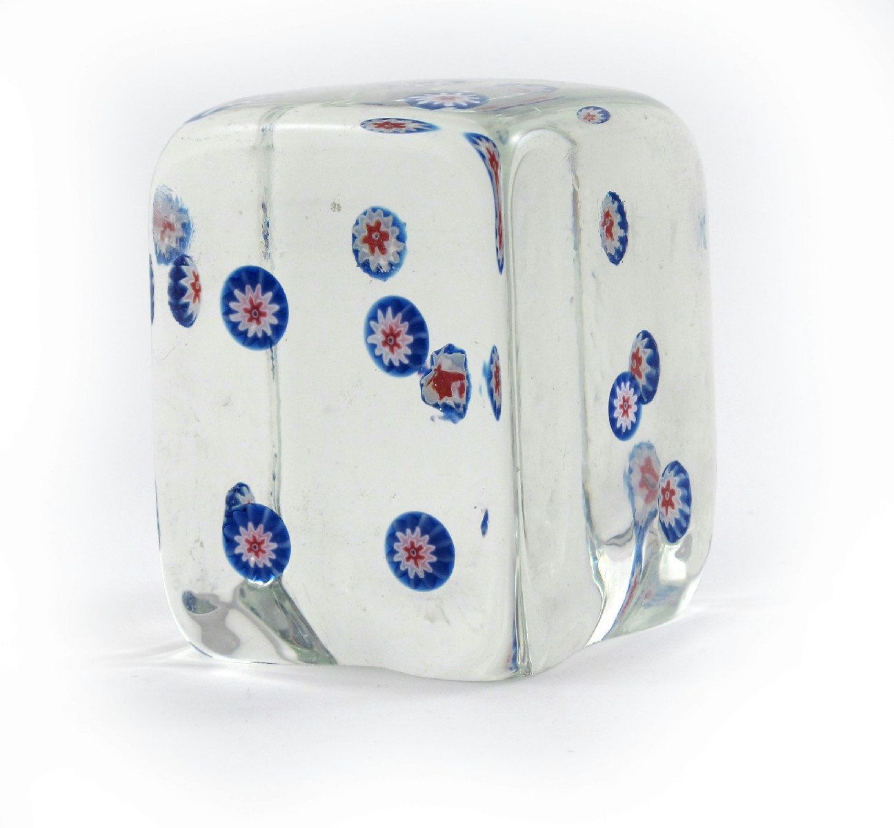 An Italian glass paperweight, clear cube with cane inclusions unsigned 9.5cm. high