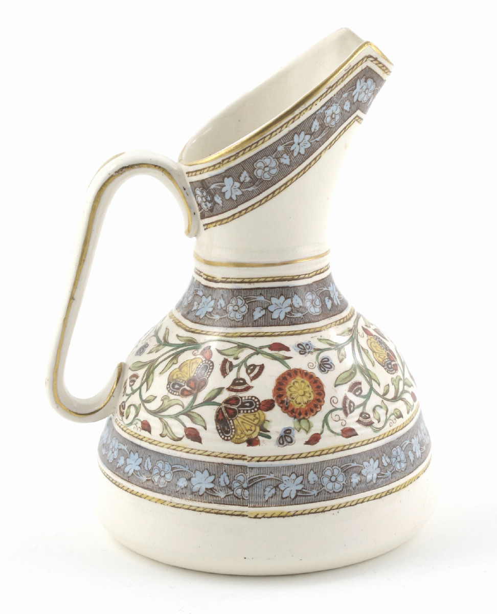 An Old Hall pottery jug designed by Dr Christopher Dresser, shouldered form with angled spout, printed with bands of stylised flowers and foliage in colours on a white ground unsigned 19cm. high