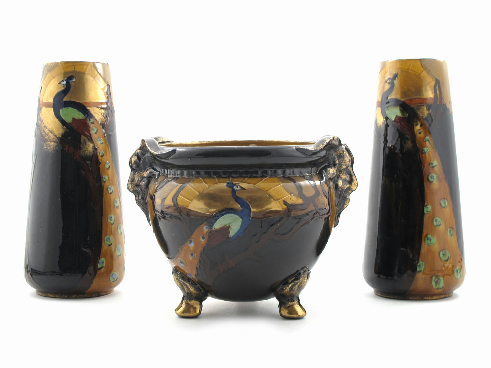 A Forrester's Phoenix Ware garniture of jardinere and pair of vases, slip decorated with a peacock before a rising sun, in colours, highlighted in gilt and another vase printed factory marks, hairlines 36cm. high