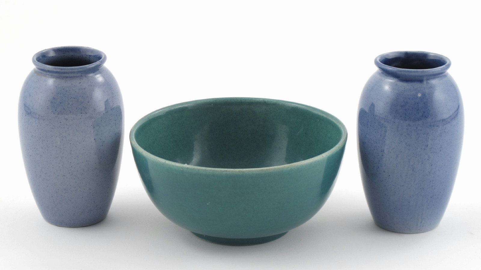 An Ashtead Pottery bowl and a pair of vases, glazed in colours printed marks, vases 10.5cm. high