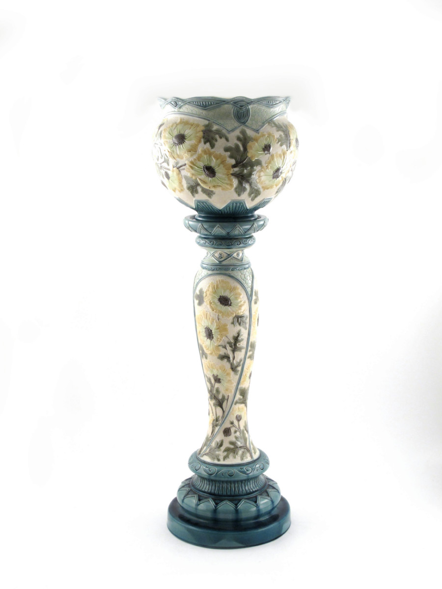 A Burmantofts Faience jardiniere and stand model no.2056, modelled in low relief with flowers and foliage in shades of yellow and blue impressed marks 105cm. high