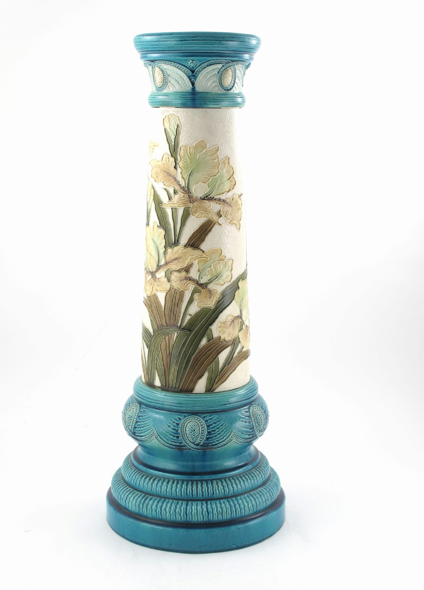 A Burmantofts Faience jardiniere stand, model no. 2023, modelled in low relief with flag iris flowers, painted in shades of yellow, green and blue impressed marks, hairline to base rim 78cm. high