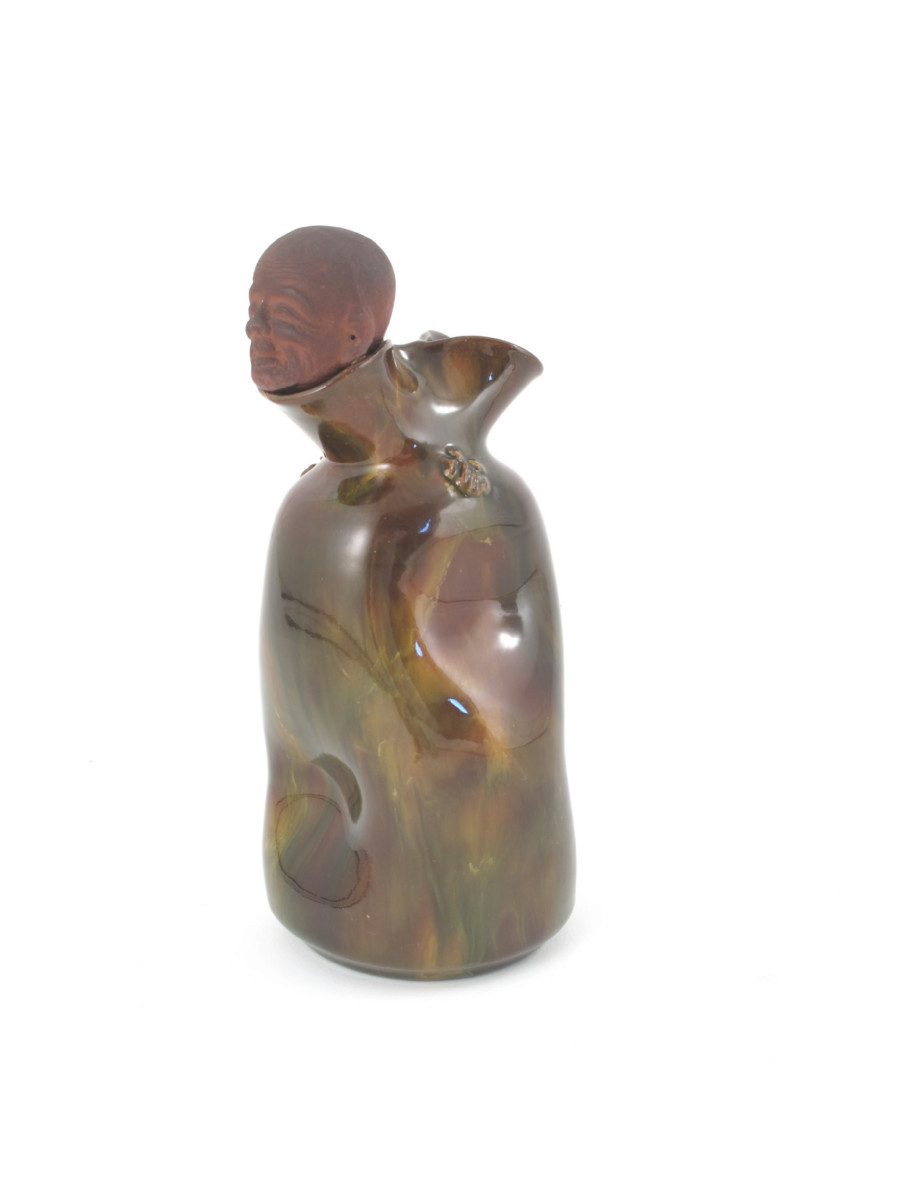A rare Linthorpe Pottery Fijian sake bottle designed by Dr Christopher Dresser, the dimpled body glazed streaked green and ochre, with unglazed terracotta head unsigned, professionally restored spout 19cm. high