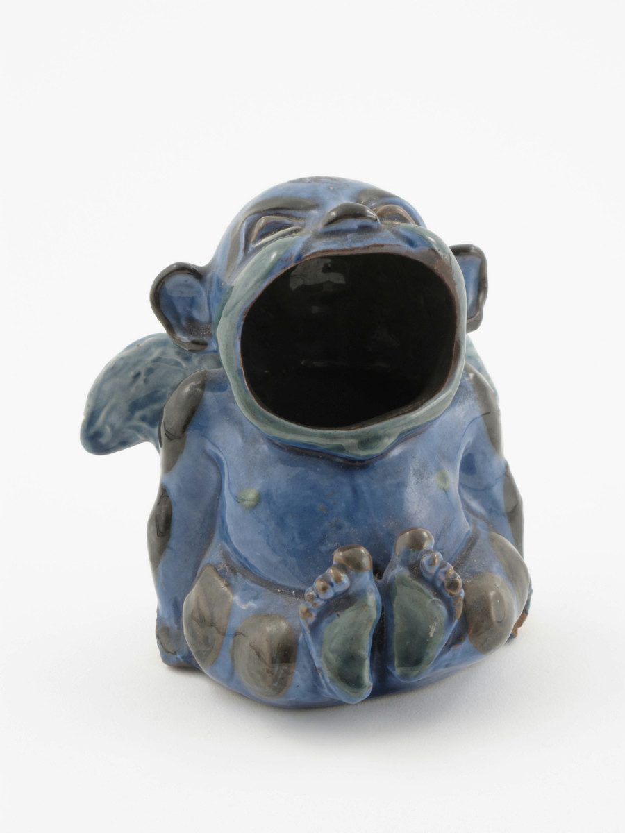 A C H Brannam Barum ware grotesque figure, designed by Blanche Georgina Vulliamy, modelled as a seated cherub with gaping mouth, glazed blue, green and brown incised marks, dated 1909, minor chips 11cm. high
