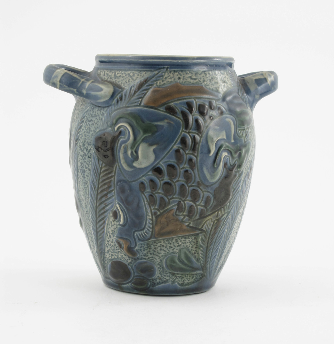 A C H Brannam Barum ware vase, twin-handled form, slip decorated with a swimming scaly fish to either side, in shades of green and blue incised marks, 14.5cm. high