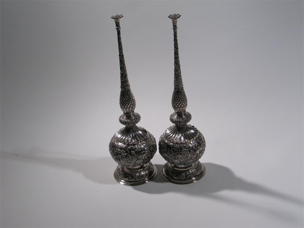 An interesting pair of Indian rosewater sprinklers with bulbous bodies