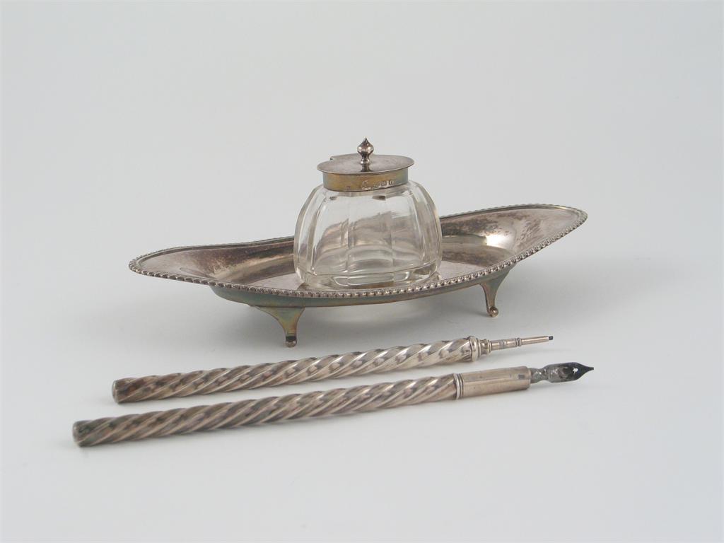 An Edwardian small oval inkstand, fitted with central mounted glass ink bottle, by Birmingham 1905 and a late Victorian fluted dip pen and pencil, 3.5oz weighable silver. (3)