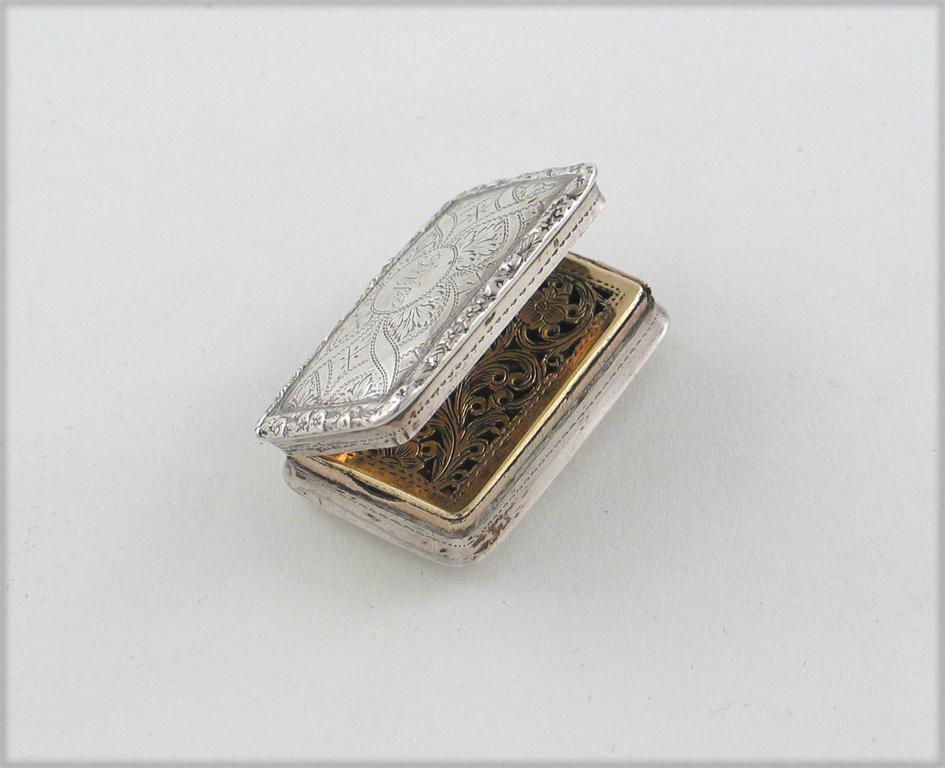 A William IV oblong vinaigrette, with concaved sides a raised floral border and ribbon-like engraving on the cover, initialled, the grille with a floral spray, by Nathaniel Mills, Birmingham 1836, 1.55in (4cm).
