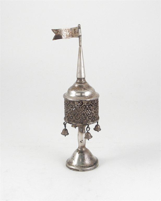 Judaica: A modern metalware spice tower, with pennant and four bells dependant, 7.75in (19.5cm).