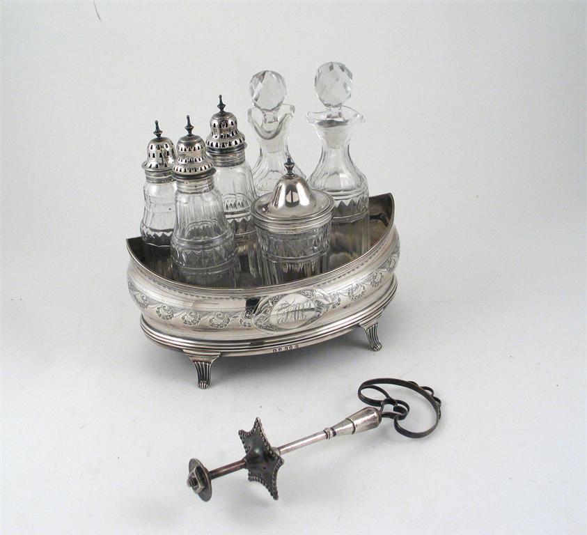 A mixed lot: a George III cruet base and four mounted bottles, by Peter, Ann & William Bateman, London 1800/05 together with a cruet handle, (non matching) and two glass bottles with stoppers. (lot)