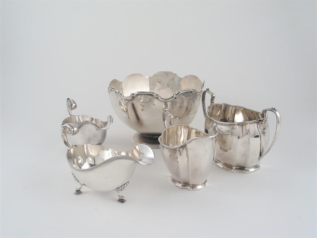 A mixed lot; A small octagonal rosebowl, by Elkington & Co, Sheffield 1909; a modern cream jug and sugar bowl, by T. Bradbury & Sons, London 1910; and a pair of plated sauceboats, 23oz weighable silver. (5)
