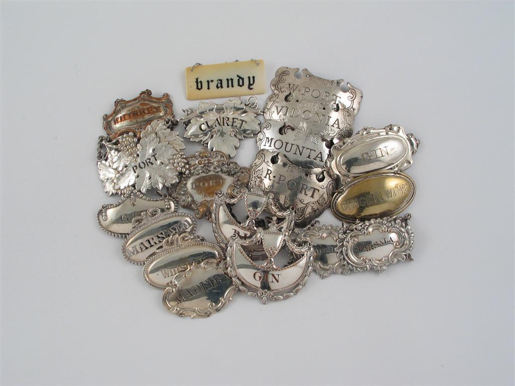 A mixed lot of nineteen plated wine labels (including a pair of Old Sheffield crescents with...