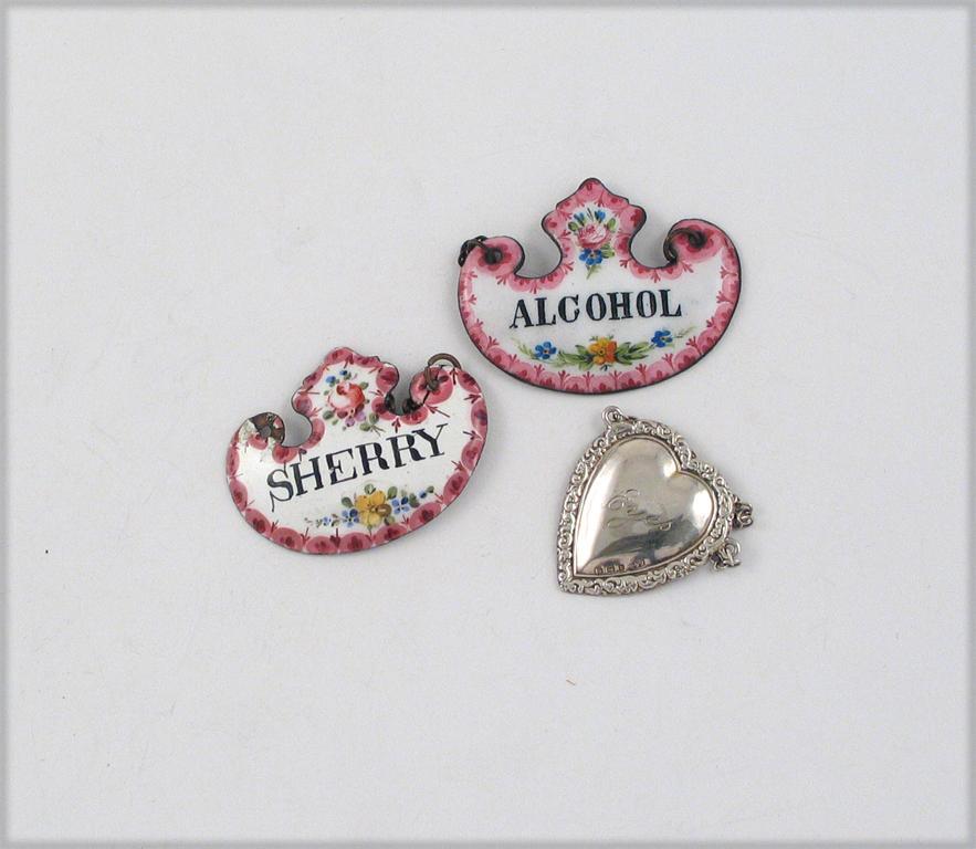 Three labels: a 19th century polychrome enamelled copper escutcheon "ALCOHOL"