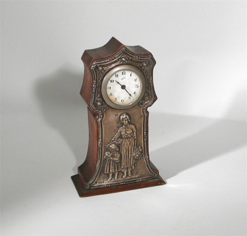 An Edwardian mounted oak timepiece, embossed on the front with a child and her mother selling flowers, 8.7in (22cm) high, maker "JA & S", Birmingham 1907.