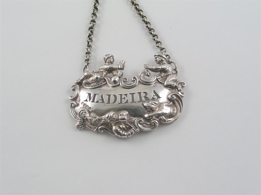 A large cast scroll escutcheon label, with carousing figures in high relief, around the border, by Edward Farrell, London c.1824 (worn letter) (retitled), 2oz.