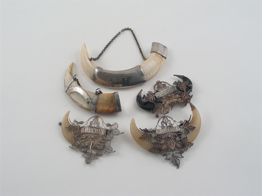 Colonial, 19th century wine labels: a pair of mounted tiger claws "MADEIRA" & "CLARET" A/F a mounted black claw label "CLARET", and two mounted boar tusk, "PORT" & "WHISKY" all probably Indian 2nd half of the 19th century. (5)