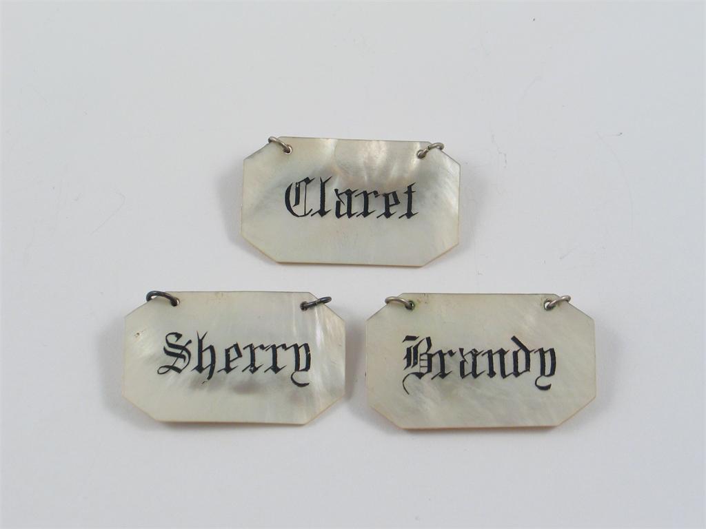 A set of three 19th century canted, mother of pearl wine labels, incised and infilled CLARET, SHERRY & BRANDY. (3)