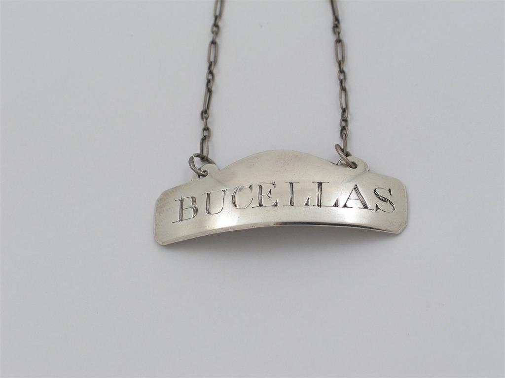 A George III Irish wine label, with a domed top section incised "BUCELLAS", maker's mark "I.E" possibly by James Ebbs, Dublin 1812, retailer's mark of "LAW".