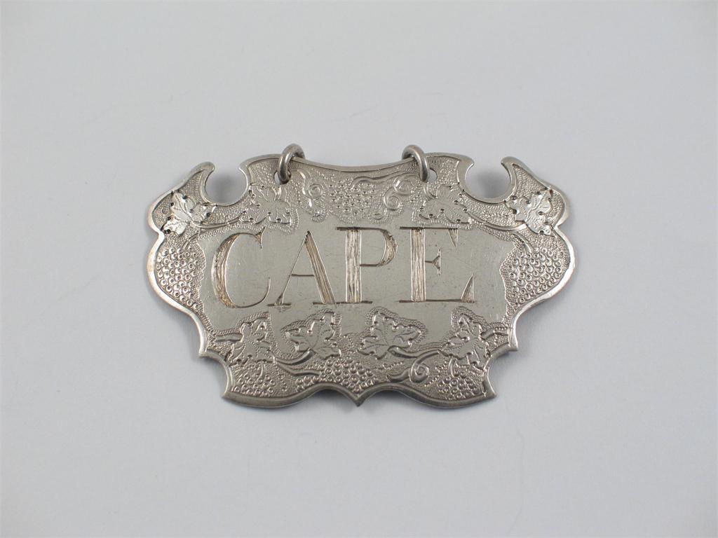 A George II escutcheon wine label, with a chased border of fruiting vines, incised "CAPE" by Sandilands Drinkwater, London c.1745 (maker's mark & lion passant only).