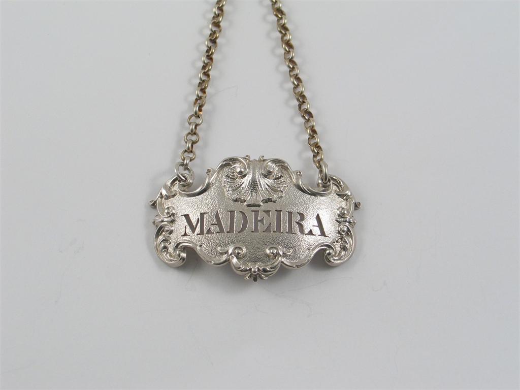 A George IV shaped escutcheon wine label, with a frosted finish and a husk and scroll border, pierced "MADEIRA", by Robert Garrard, London 1823.