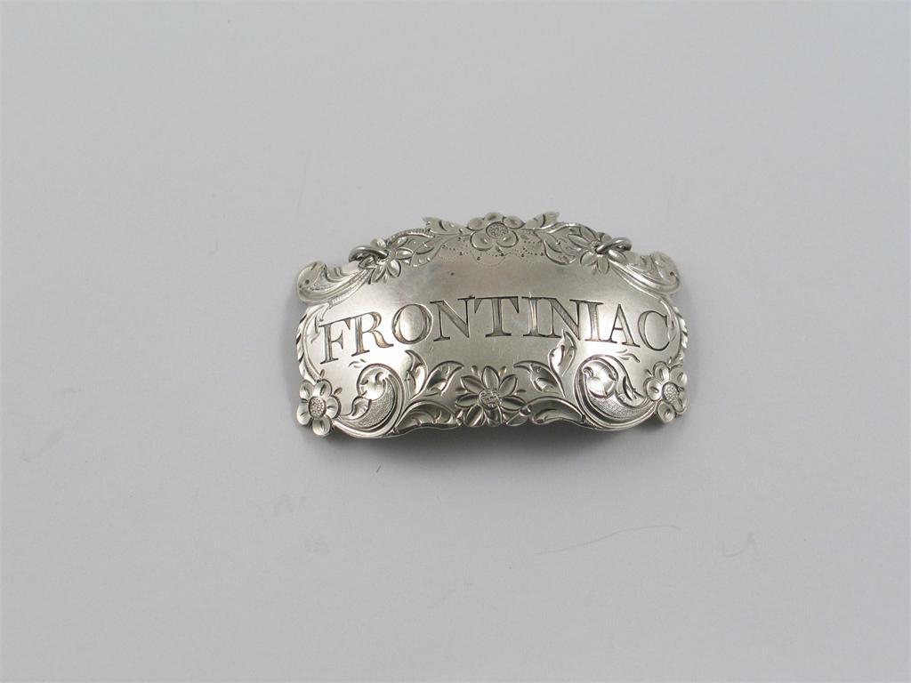 A George III wine label, with a shaped, bright-cut border of flowers and scrolls, incised "FRONTINIAC", by Hester Bateman, London c.1775 (maker's mark only, twice).