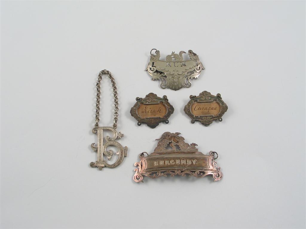 Five plated wine labels: a pair with slot-in titles, a cut out "B" and two others with surmounts. (5)