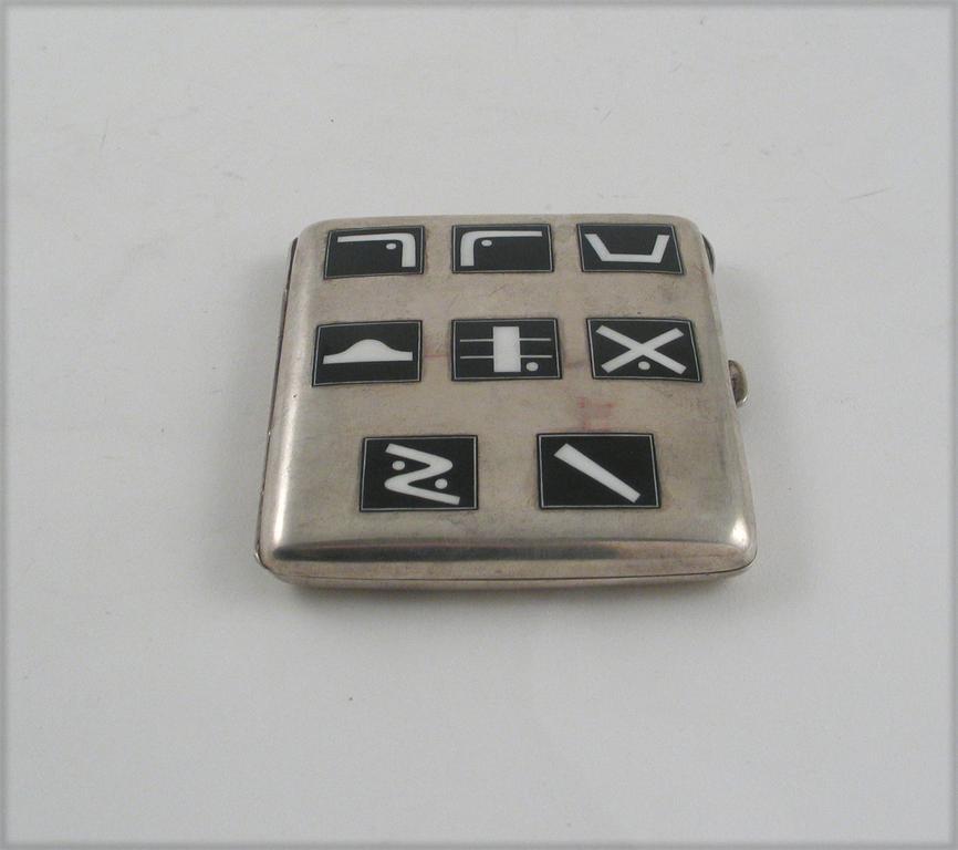 A curious continental cigarette case, enamelled on the cover in monochrome with a series of eight symbols, gilt interior, the reverse inscribed "Vicky" & 23.II.1911", 3.5in (8.8cm) square, 5.5oz.