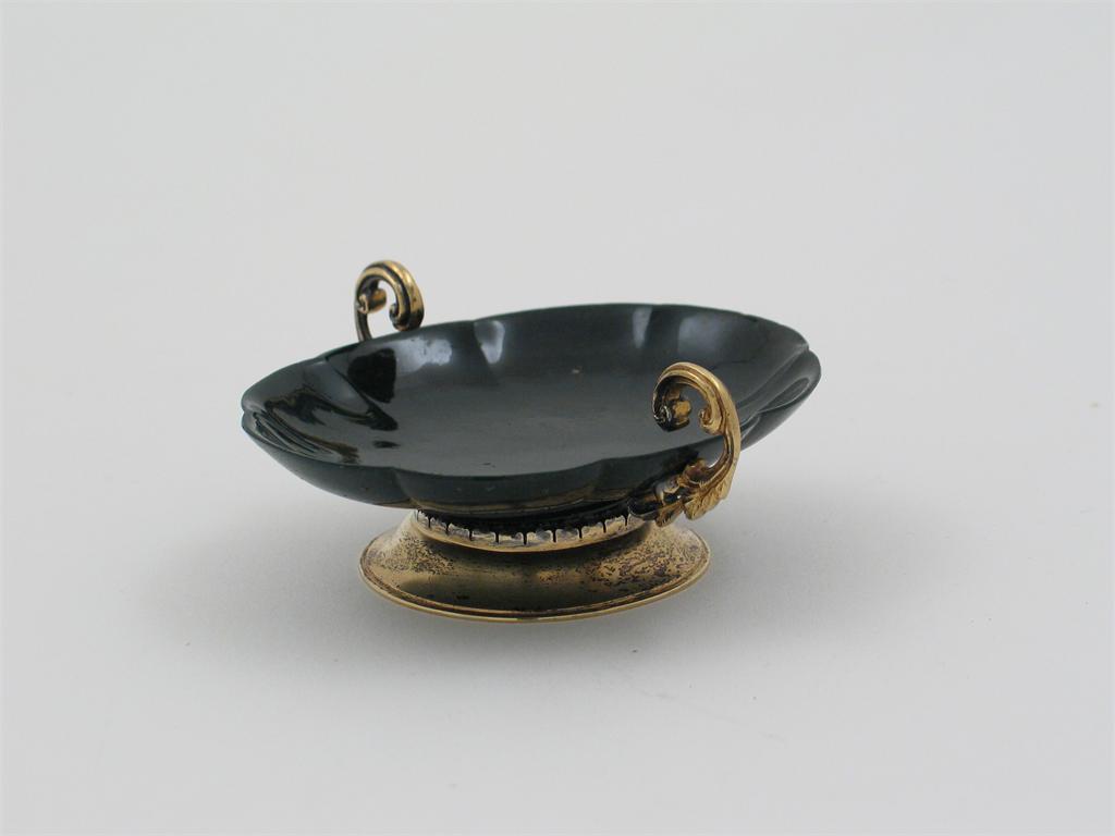 An 18th century silvergilt mounted hardstone bon bon dish, on a domed oval foot and two small upswept scroll handles, unmarked, continental, 18th century 3.5in (9cm) wide.