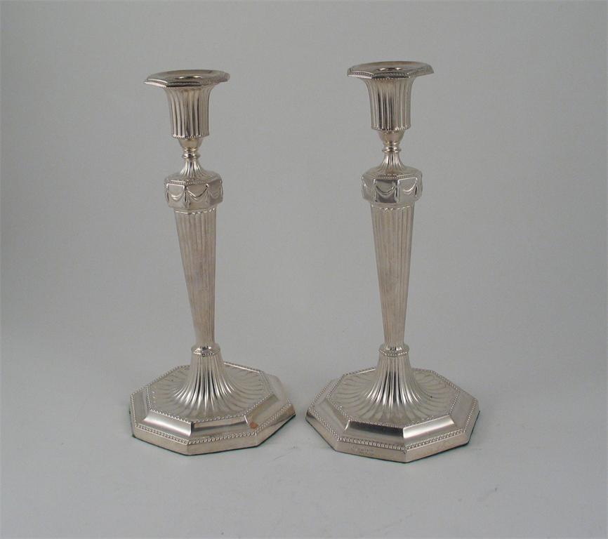 A pair of Edwardian candlesticks, with fluted columns and capitals and octagonal bases with bead borders, detachable nozzles, by Charles Boyton & Sons, London 1907 (loaded), 11in (28cm) high. (2)