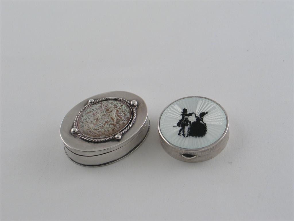 Two small modern pill boxes: one oval, inset on the cover with a Chinese, carved mother of pearl panel; the other circular with a pearlescent enamelled cover, painted in silhouette with a dancing couple. (2)