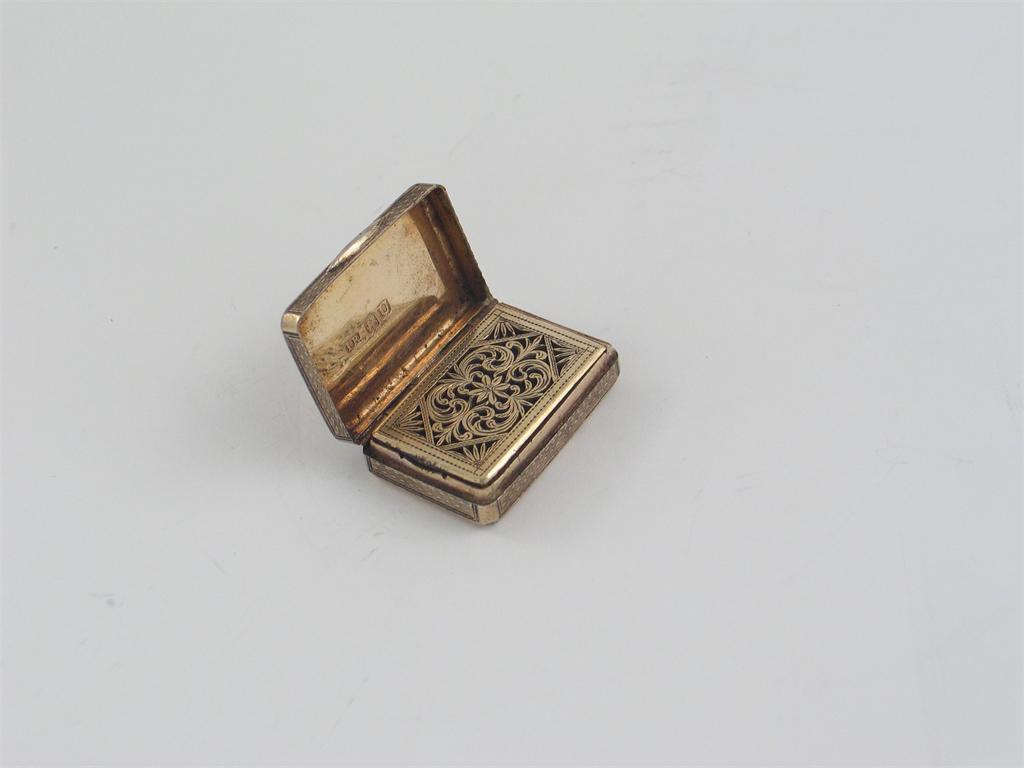 A George III oblong silvergilt vinaigrette, with engine turned decoration, by John Reily, London 1815, 1.35in (3.4cm) long.