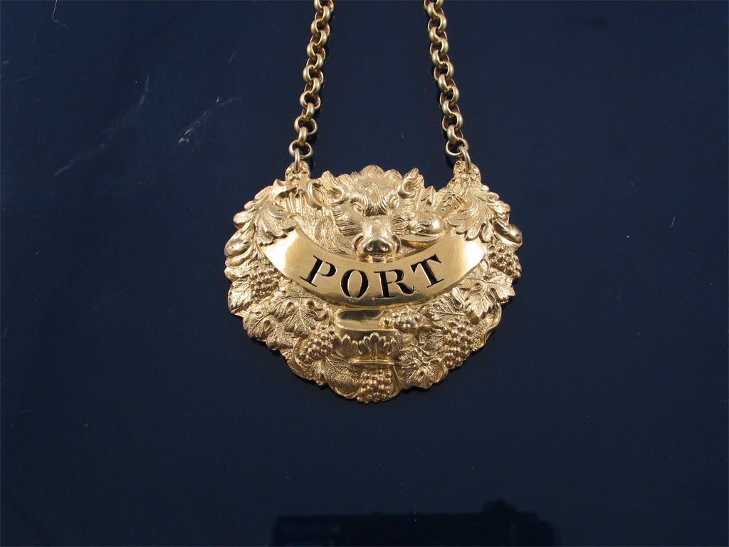 A George IV silvergilt wine label, cartouche shaped and stamped with a boar mask, weapons of the chase, fruiting vines and a goblet, pierced "PORT", by Thomas Johnson, London 1826. See Wine Labels 1730-2003 by John Salter pp 95 for a similar label.