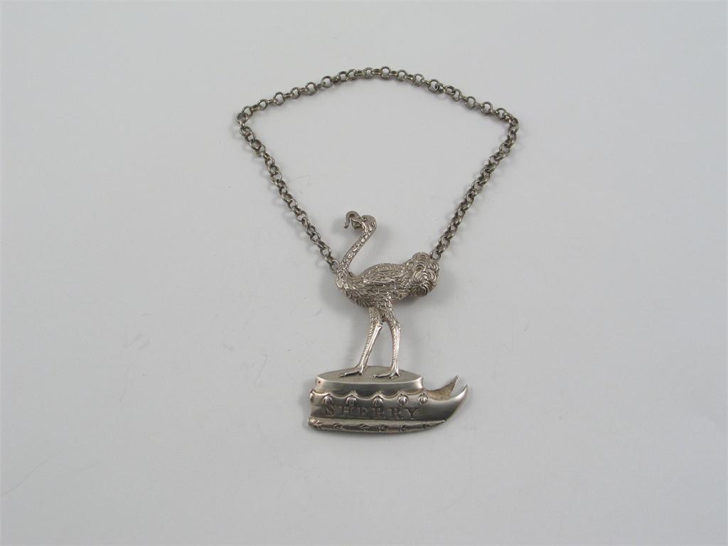 A rare early Victorian heraldic wine label, in the form of an ostrich with a horseshoe in its beak * on a cap of maintenance, pierced "SHERRY", unmarked c.1840. * For Viscount Coke, Earl of Leicester. See Wine Labels 1730-2003 by John Salter pp 95, 98 & 158 for similar labels.