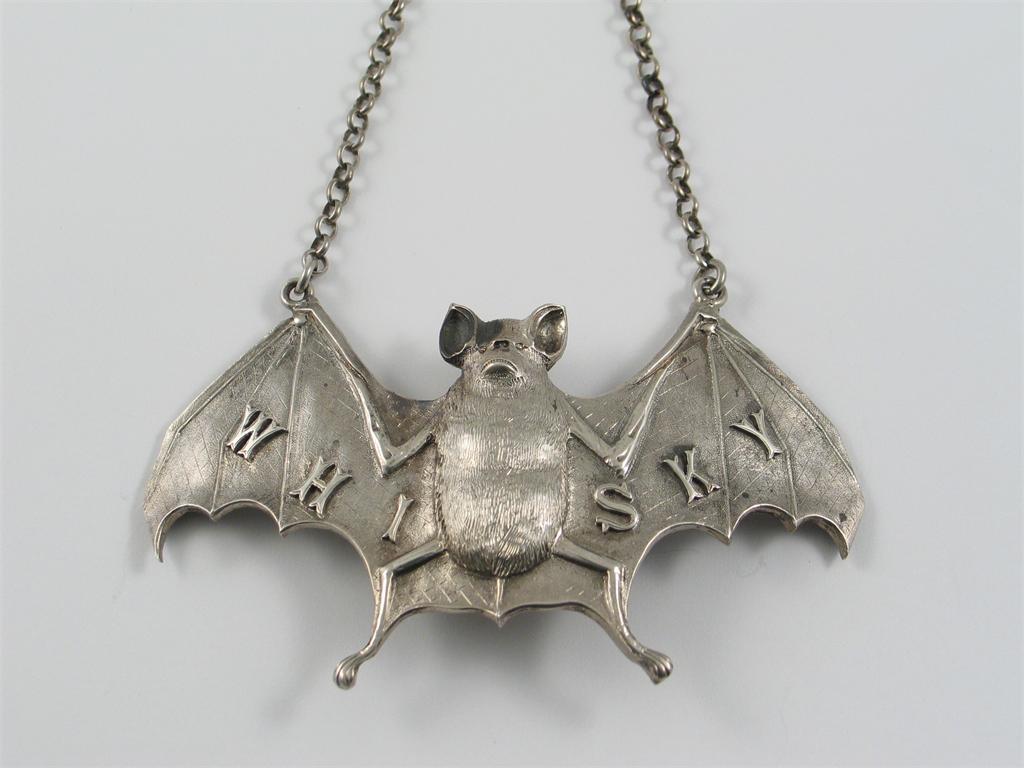 A rare 19th century wine label, in the form of a fruit bat with outstretched wings, texturing and hatched decoration, with the applied title "WHISKY", unmarked probably Anglo Indian/Chinese 2nd half of the 19th century.