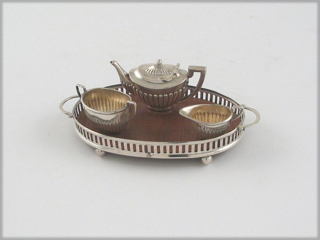 An Edwardian miniature or toy cream jug and sugar bowl, with fluting and a mounted wooden tray, all by C. Saunders & F. Shepherd, Birmingham 1901, together with a teapot by Levi & Salaman, Birmingham 1910, the tray 4.1in (10.25cm) wide. (4)