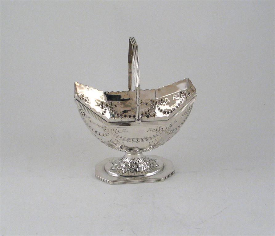 A Victorian swing handled sugar basket, on a shaped and reeded foot, with embossed decoration, by F. Sibray & J.F. Hall, London 1887, 5.5in (14cm) wide, 7.75oz.