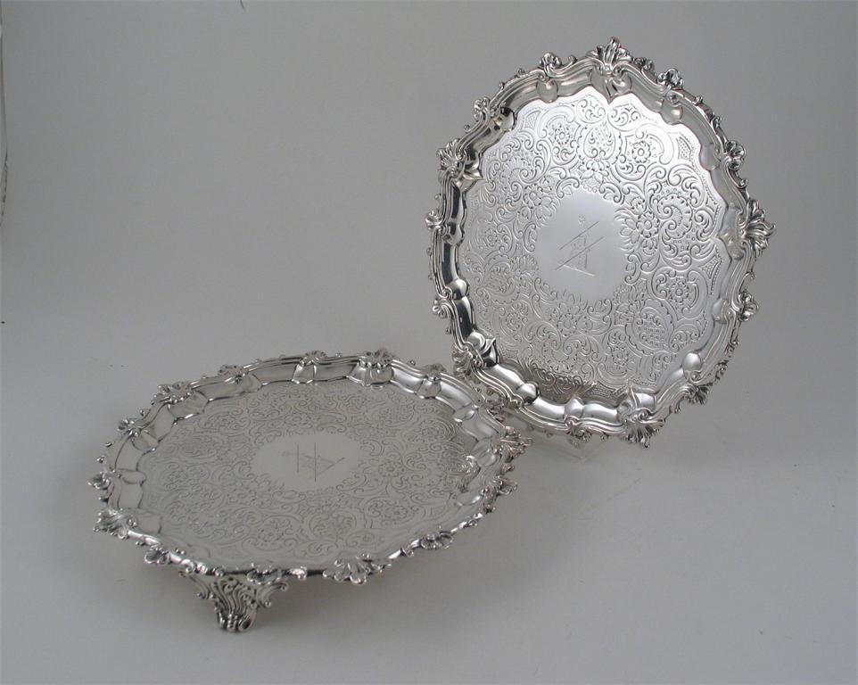 A pair of George IV decorative salvers, with flat-chasing, husk and scroll borders and scroll feet, crested, by William Brown, London 1827, 9.25in (23.5cm) diameter, 32oz. (2)
