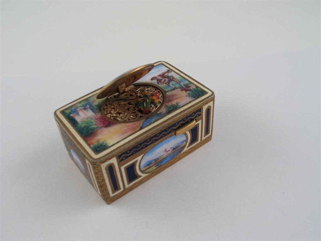 A 20th century gilt metal and polychrome enamel, singing bird box, with lakeland scenes, and figures in a country landscape, 4in (10cm) wide.