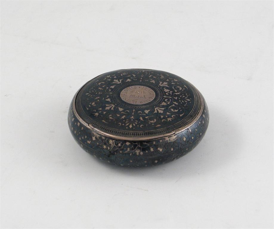 A late 19th century Austro Hungarian niellowork tobacco box, of squat circular form, gilt interior, inscribed L the centre "TEMESVAR MOSTAR ERINERUNG 1880 - BOLIK MOTAK", 3in (7.6cm) diameter, 2.5oz.