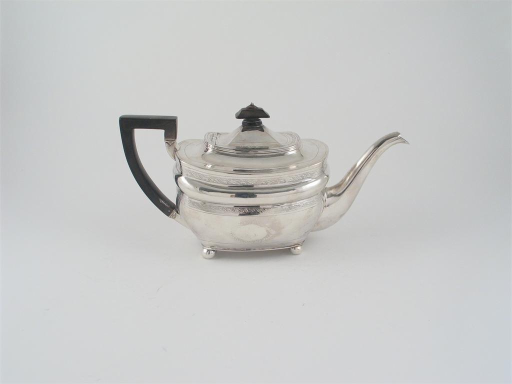 A George III teapot on ball feet, with two engraved floral friezes, by Alice & George Burrow, London 1805, 15oz.