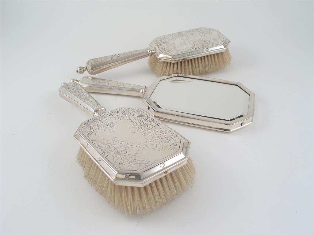 A modern matched, hand mirror and two hair brushes, with chased, chinoiserie decoration and ball finials, by D & J. Welby, London 1915/1923. (3)