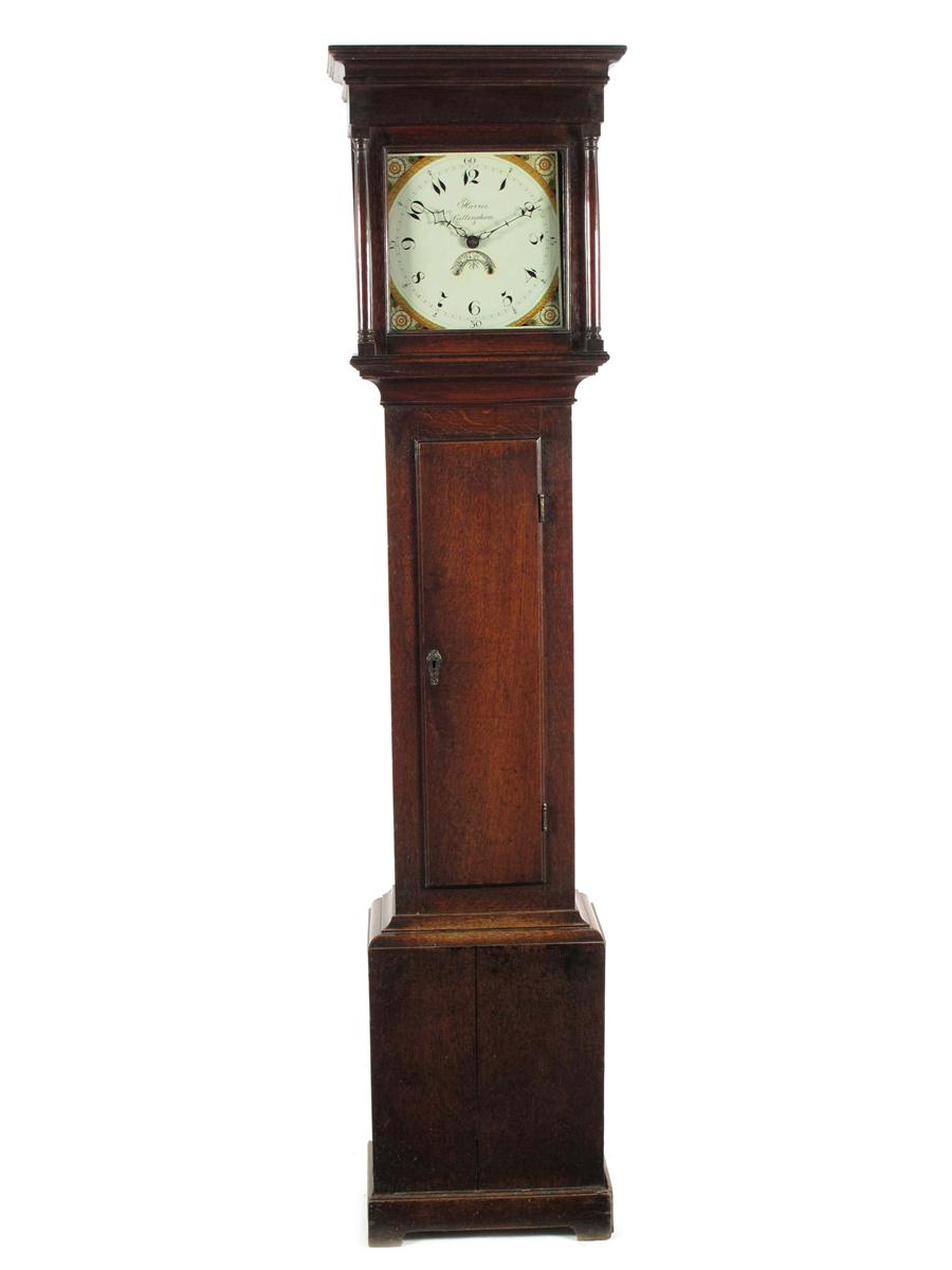 An oak longcase clock, the 30 hour movement striking on a bell, with a 11 inch painted square dial with pierced crescent date aperture signed Harris, Gillingham, the hood with fruitwood pilasters, 78.25in (198.5cm) h.