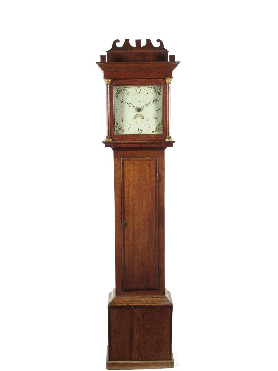 An oak and mahogany longcase clock, with a 30 hour movement striking on a bell, and a painted 11 inch square dial, signed THOS. POLLARD EXETER, with crescent shape date aperture, 78in (198cm) h.