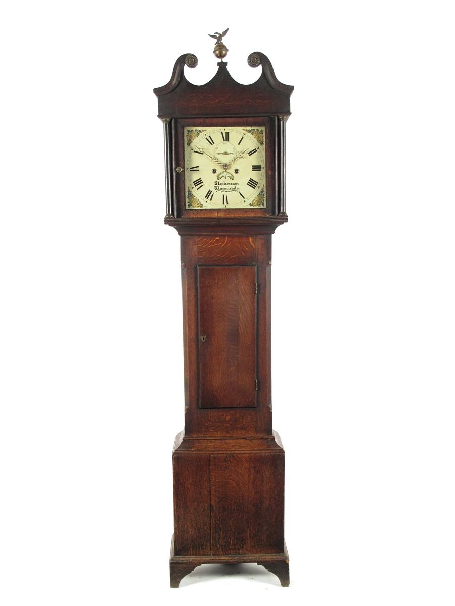 A 19th century oak longcase clock, with an 8 day movement striking on a bell, with a painted and printed 12 inch square dial, with subsidiary seconds dial and crescent shape date aperture signed Stephenson, Warminster, 84.5in (212cm) h.